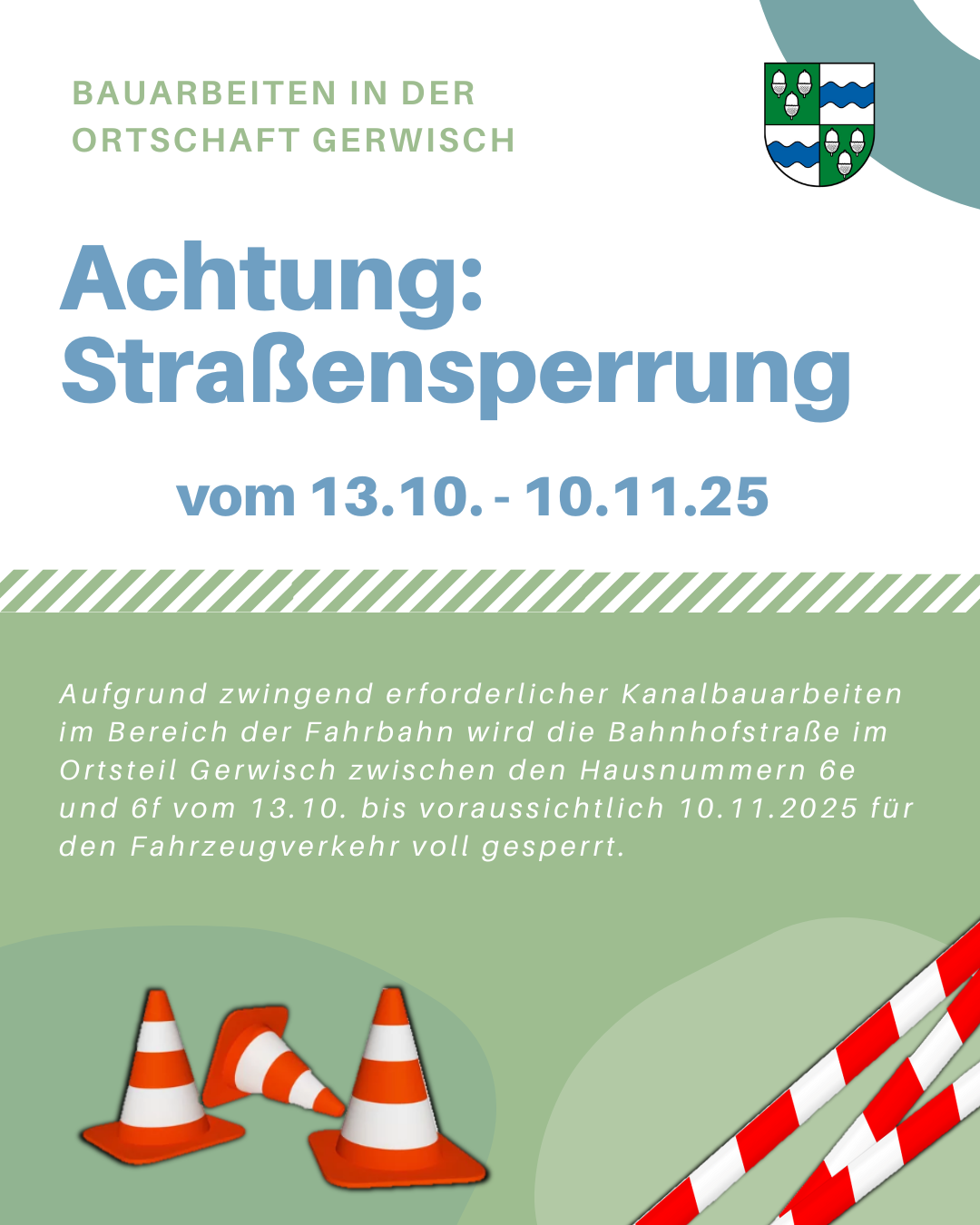 Aufgrund zwingend erforderlicher Kanalbauarbeiten im Bereich der Fahrbahn wird die Bahnhofstraße im Ortsteil Gerwisch zwischen den Hausnummern 6e und 6f vom 13.10. bis voraussichtlich 10.11.2025 für den Fahrzeugverkehr voll gesperrt.