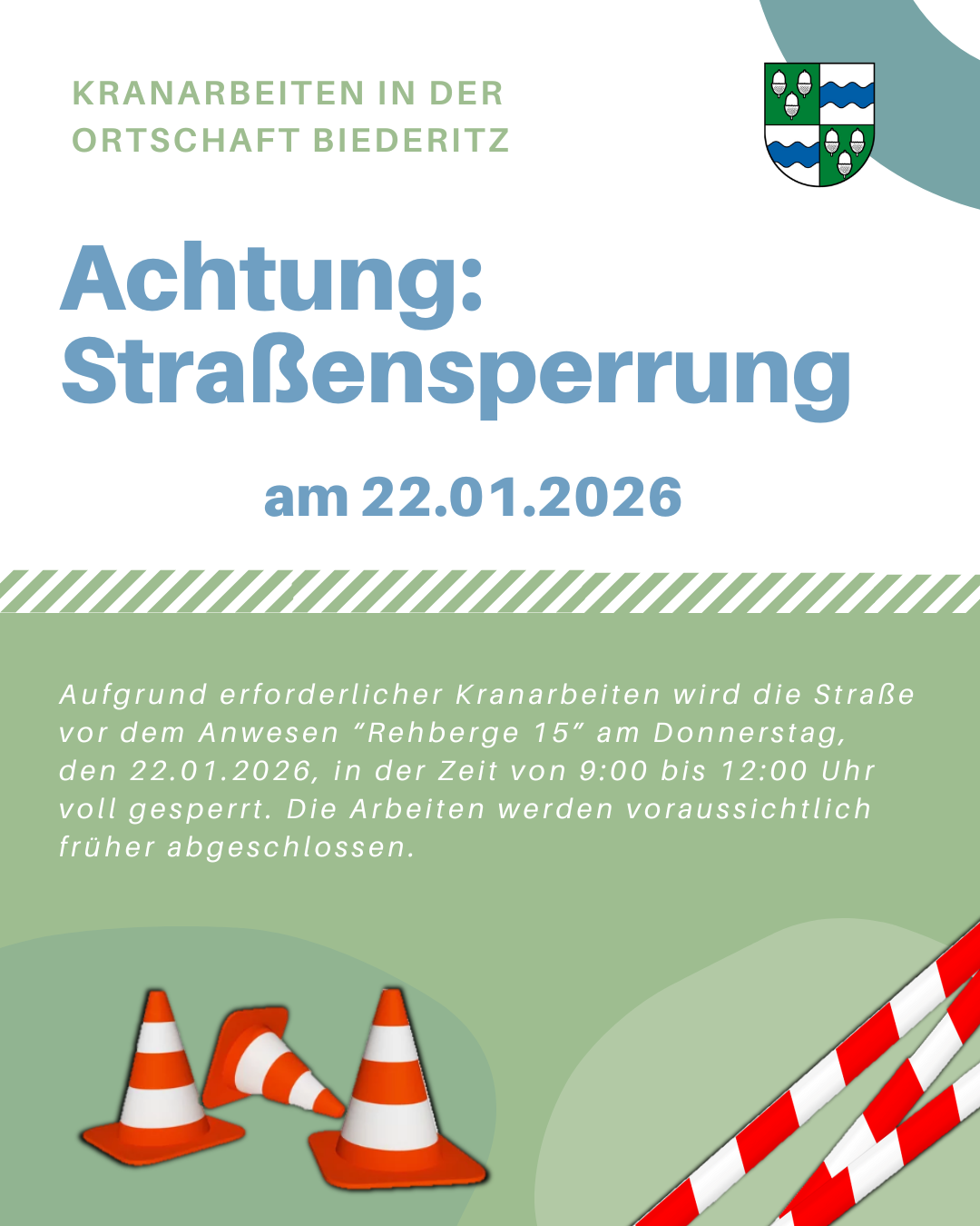 Aufgrund erforderlicher Kranarbeiten wird die Straße vor dem Anwesen Rehberge 15 am Donnerstag, den 22.01.2026, in der Zeit von 9:00 bis 12:00 Uhr voll gesperrt. Die Arbeiten werden voraussichtlich früher abgeschlossen.