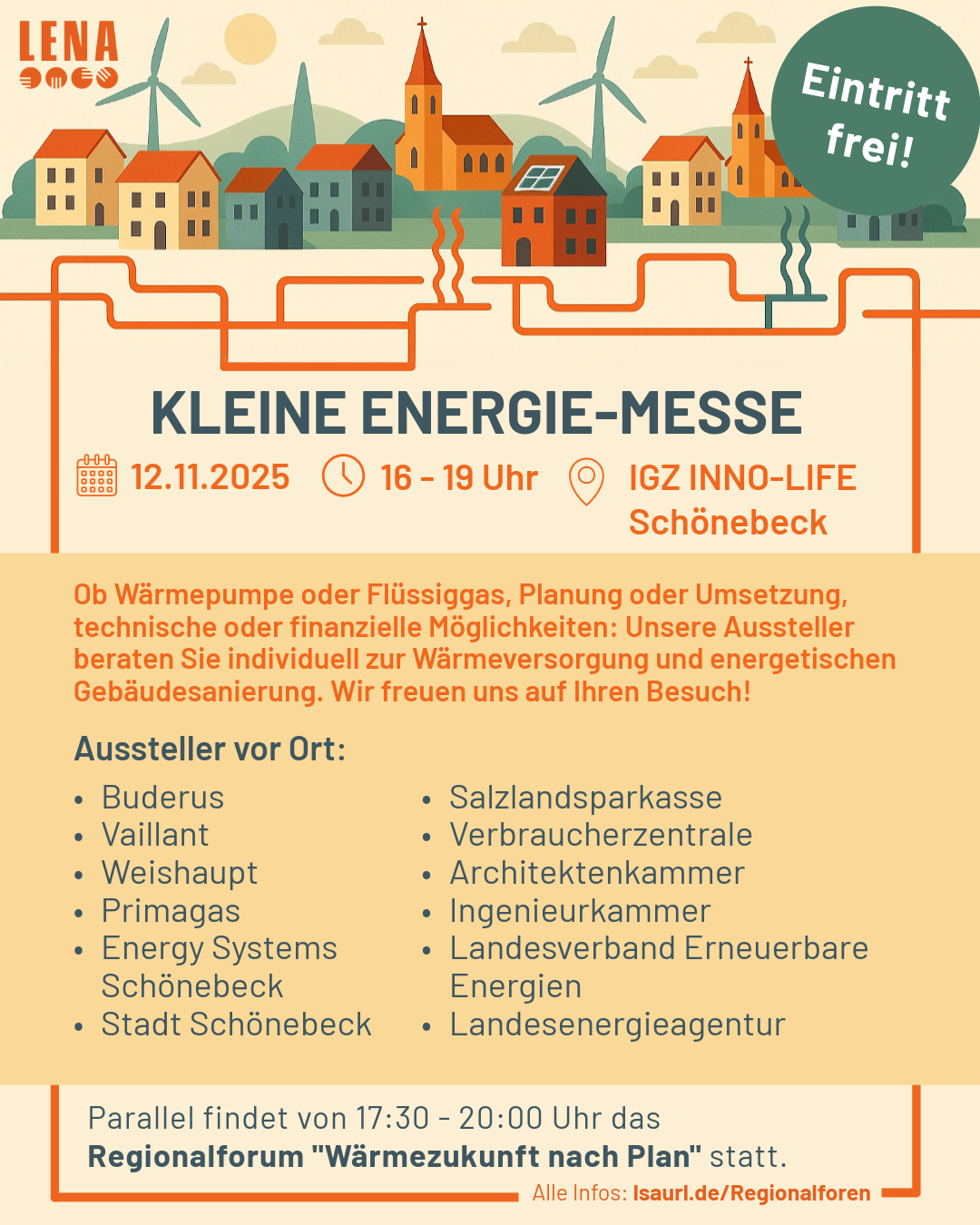 Die LENA beantwortet all‘ diese Fragen gemeinsam mit renommierten Ausstellern am 12. November von 16 bis 19 Uhr auf einer kleinen Energie-Messe im IGZ INNO-LIFE in Schönebeck (Elbe). Lass‘ dich individuell beraten und dir von Heizungsherstellern vor Ort die Funktionsweise und Eignung einer Wärmepumpe oder anderer Alternativen erklären! Informationen zu Fördermöglichkeiten und gesetzlichen Regelungen bekommst du außerdem. Eine Anmeldung ist nicht erforderlich. Der Eintritt ist frei.
