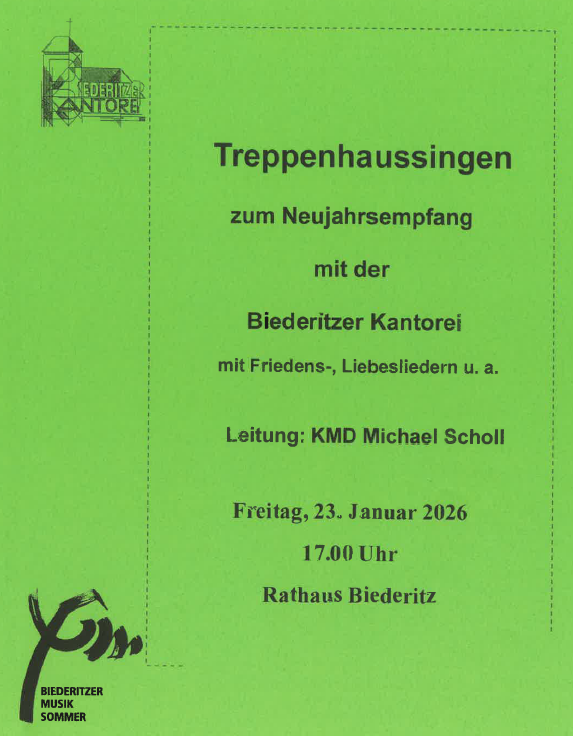 Die Biederitzer Kantorei wird hier mit einem Treppenhaussingen Lust auf ein gut klingendes neues Jahr wecken. Erklingen werden Liebes- und Friedenslieder. Zu Beginn singt der Chor Gospels, die Freude auf Neues wecken. Als Abschluss wird mit allen der Kanon „Dona nobis pacem“ gesungen. So geht von dem Treppenhaussingen ein Friedenszeichen aus für unsere Gemeinde und darüber hinaus.